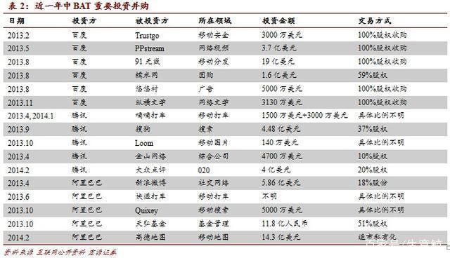 曾经有人寄希望与移动互联网的发展能够打破BAT一统天下的格局,但是2013年互联网的并购热潮显然是这三家互联网巨头瓜分二线资产的圈地活动,由于行业内巨头间跨界竞争的激烈程度在不断加剧,以及BAT手中资金依然充裕,有理由认为2014年行业中并购整合会继续,这会使得马太效应继续放大,新参与者难有立足之地。