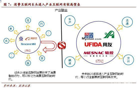 阿里和腾讯虽然在消费互联网领域牛气冲天,但是在产业互联网应用的尝试均未取得好的效果。由于BAT的客户积累和运营经验主要集中在个人客户,其向产业互联网拓展过程中优势将不再明显。