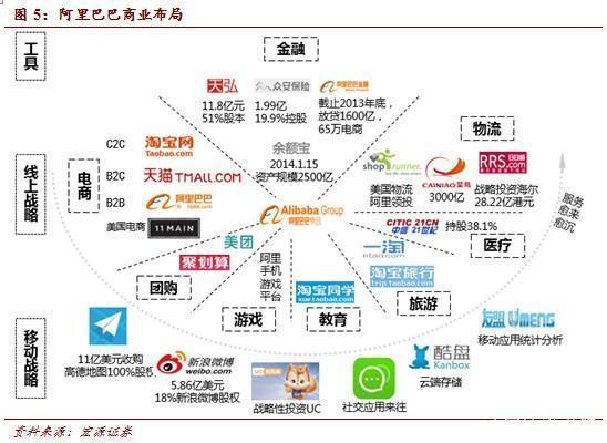而在阿里驾轻就熟的电商产业链上,阿里巴巴的投资走向了更为基础的领域,在物流领域,除了据称投资规模达3000亿的菜鸟物流网,还有28亿港元战略投资海尔集团(日日顺物流);此外阿里还投资了1家网店SAAS服务提供商“360Shop淘店通”、美国体育用品电商Fanatics等。