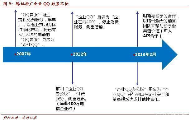 2007年,“QQ客服”诞生,半年多后,这个免费产品有了5万人次的申请。而到2013年2月更名为“企业QQ”的“企业QQ办公版”的经过了6年的积累企业用户也只有30万,与其在消费互联网领域的地位相差甚远。