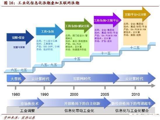电子商务和物联网的迅猛发展加速企业虚拟化进程。自20世纪90年代初,ERP、CRM、OA等运营管理软件陆续面世,并在企业中得到广泛应用,开启了企业的虚拟化进程。电子商务的出现,为企业提供了线上的采购与销售通道,尤其是经过2003年和2008年两次关键拐点,电子商务在企业中的应用大幅提升,几乎成为企业“标配”,且服务内容也日益丰富、深入,不再是单纯的信息撮合,已经开始向集信息、交易、金融为一体的综合服务演进,据统计2013年中国B2B电子商务的市场交易规模高达6.8万亿元,企业用户为1850万。目前,部分企业已经推动生产制造的数字化、智能化,软控股份为橡胶行业提供智能设备、机器人,国际巨头GE更是举起了工业互联网大旗。