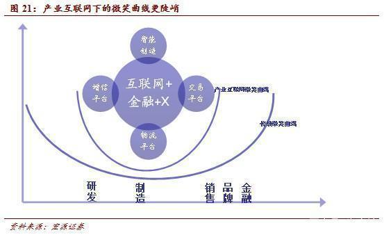 全领域渗透,产业互联网影响深远广泛。产业互联网对生产、销售流通、融资、物流交付各个领域都会产生较大影响,互联网+金融+各个领域的全新商业模式、新微笑曲线将在各个产业环境中形成具有影响力的平台公司。