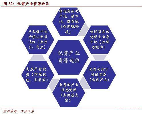 优势产业资源地位一方面体现在区域经济里面的优势地位,比如地理位置优势,临近资源产地、消费地、存储地;一方面体现在产业链中的核心位置,比如阿里和京东,在产业链中的地位有优势,凭借优势地位和信息优势对企业进行互联网融资服务;或者拥有广泛的渠道网点资源等。
